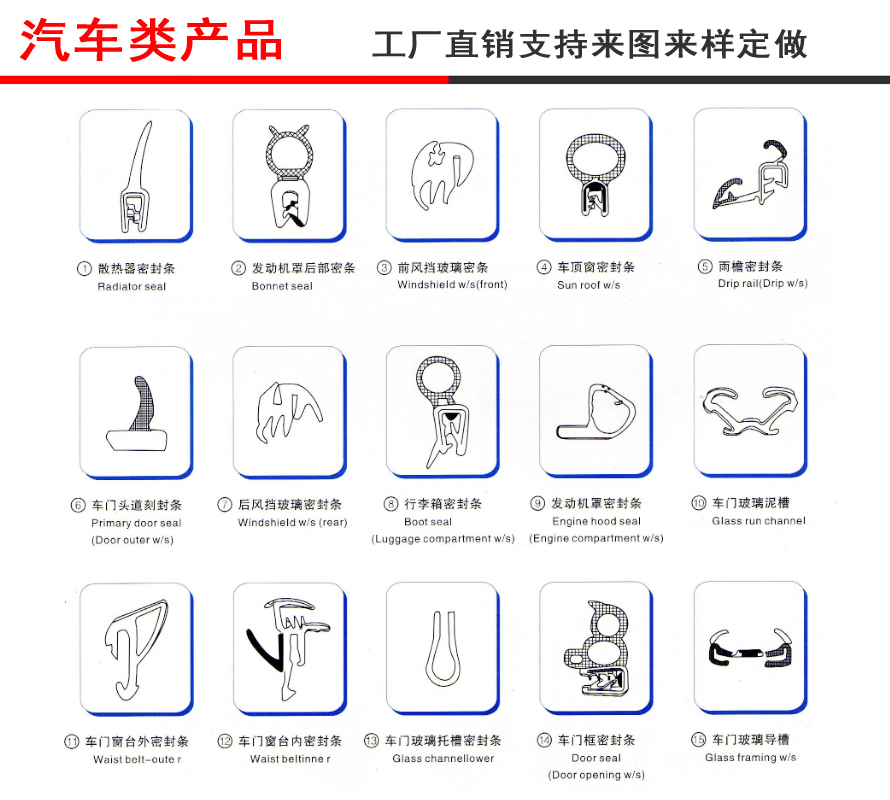 內(nèi)外側(cè)條(水切)(waistline),行李箱密封條(trunk seal),防噪聲密封條(anti-noise),防塵條(anti-dust)等。